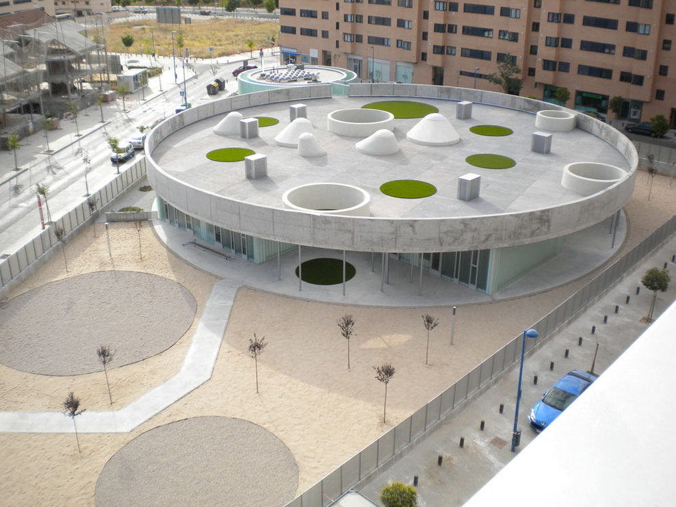 建筑以一個圓形的大屋蓋將幾座不同功能的空間涵蓋在一起,不同建筑之間形成課間活動的場所。屋頂上則成為活動操場,操場上不同的凸起作為為下面采光的天窗??臻g的趣味成為開拓孩子們想象力的重要手段之一。