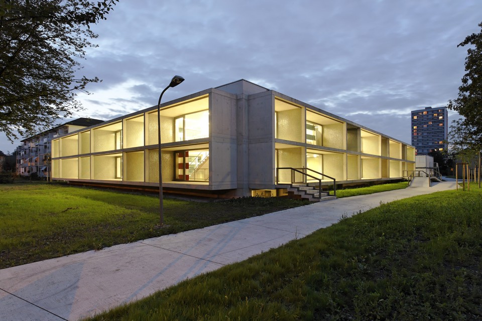 位于瑞士蘇黎世Hirzenbach區(qū)域的城市結(jié)構(gòu)如同花環(huán)般層次分明,外圍的公寓樓高低起伏,環(huán)繞著中間開闊、平坦而低矮的學(xué)校建筑。而由Basler & Hofmann事務(wù)所所新建的建筑意在加強現(xiàn)有城市肌理的邏輯關(guān)系,在學(xué)校的北面建起了一座僅僅有一層高的幼兒園,而南邊的半下沉體育館則充分考慮了其作為開放性公共空間的通透性。