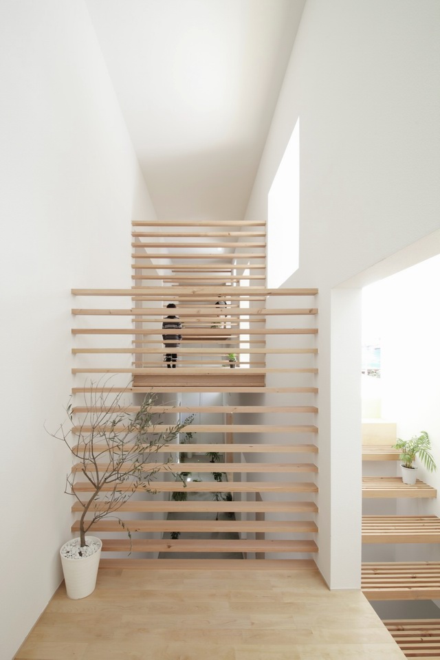 于是設(shè)計師就有了一個反L的建筑方案,而陽光收集器就是搞起來的那一部分,通過建筑頂部的天窗和方窗把陽光大口的吞噬到了室內(nèi),在室內(nèi)的陽光收集器也作為樓梯,在第二層部分設(shè)計了幾間臥室,為了能讓陽光更加有效的投到首層,樓梯采取了格柵的形制,這樣使得陽光的光想盡可能的漏下去。