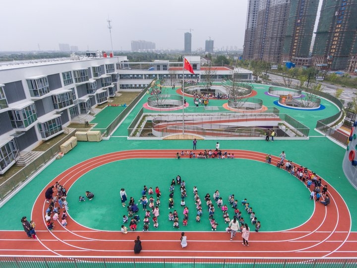 在浙江湖州長興縣龍山街道的中心幼兒園,在十月十七日正式開園,這是一個(gè)投資八千萬元占地十九畝的幼兒園,據(jù)了解這個(gè)幼兒園的設(shè)計(jì)理念是來源于日本,在日本富士有個(gè)幼兒園和空山中心幼兒園一樣都是在郊外建設(shè)的,因?yàn)橥恋赜邢薜菍W(xué)生們還是需要一個(gè)可以給學(xué)生運(yùn)動(dòng)的的操場,為了解決這個(gè)場地不足的問題所以設(shè)計(jì)師還講操場跑到設(shè)計(jì)到了屋頂,做成了一個(gè)環(huán)形結(jié)構(gòu),之所以要這樣設(shè)計(jì)是因?yàn)楹⒆拥倪\(yùn)動(dòng)規(guī)律是特別喜歡跑圈。