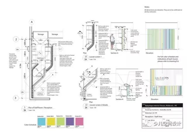 幼兒樂園的入口處設置了透明的玻璃門,純白色的金屬百葉窗,簡潔利落的百葉窗顯得美觀大方。入口的一側還設有接待臺,同樣是由柔和彎曲的彩色百葉窗造型設計而成。Babysteps的標識置于接待臺后面的墻上,五彩的字體設計更顯活潑可愛。燈光打在百葉窗上形成微妙的光影,使得BabySteps產生了一個工藝的視覺形象。
